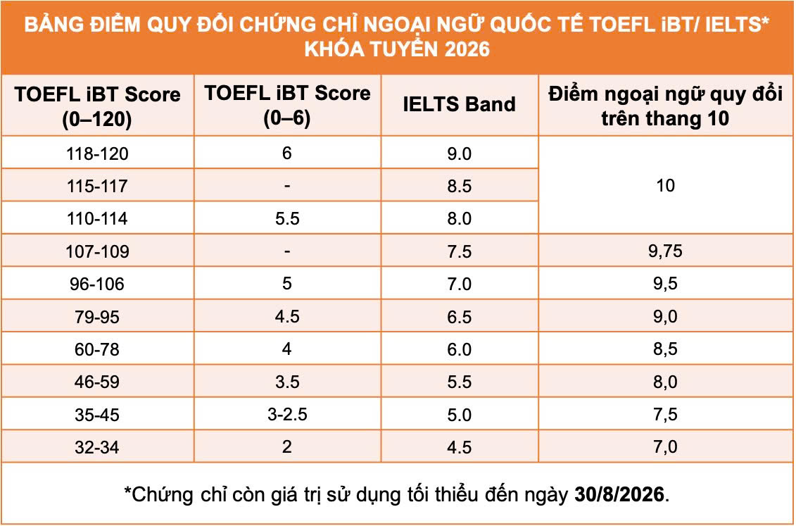 - Tất cả chứng chỉ ngoại ngữ quốc tế tiếng Anh (TOEFL iBT hay IELTS) chỉ được quy đổi sang điểm môn tiếng Anh (chỉ áp dụng đối với các tổ hợp có môn tiếng Anh của kết quả kỳ thi THPT 2026 trong Phương thức 2) khi thí sinh gửi minh chứng về cho Trường theo đúng thời gian quy định của Thông báo tuyển sinh đối với từng phương thức. Đối với Phương thức 2, chứng chỉ ngoại ngữ quốc tế tiếng Anh (TOEFL iBT hay IELTS) được quy đổi từ mức 4.5 trở lên theo quy định.